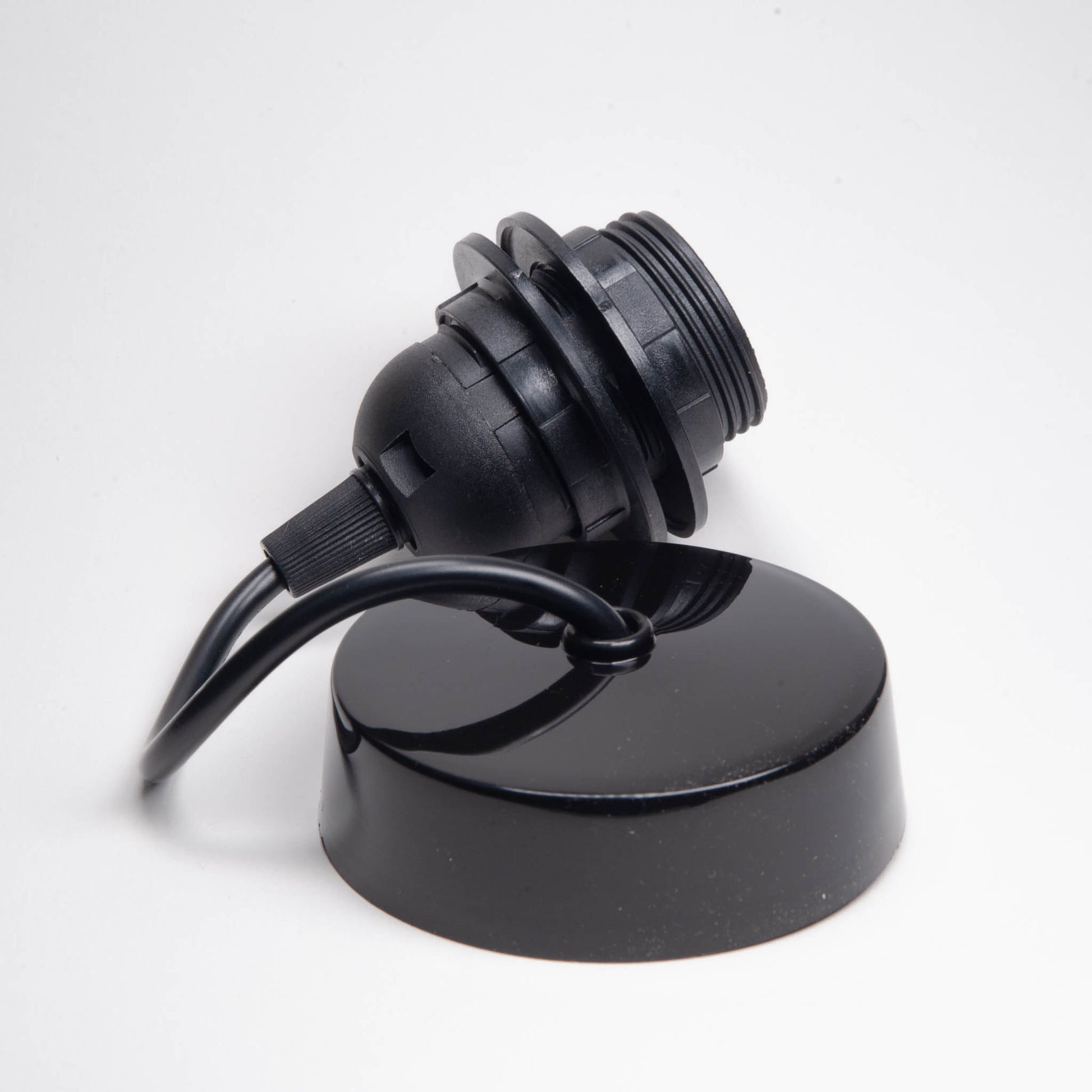 The pendant set consists of a black plastic 85mm diameter ceiling rose including a moulded mounting plate with integral wiring terminals. Ready wired with black pvc flex to a black E27 wide ring lampholder, also referred to as an ES fitting. The lampholder is 38mm wide and has removable shade rings to fit lampshades with a 40mm hole, it can be used with or without a lampshade or shade rings.