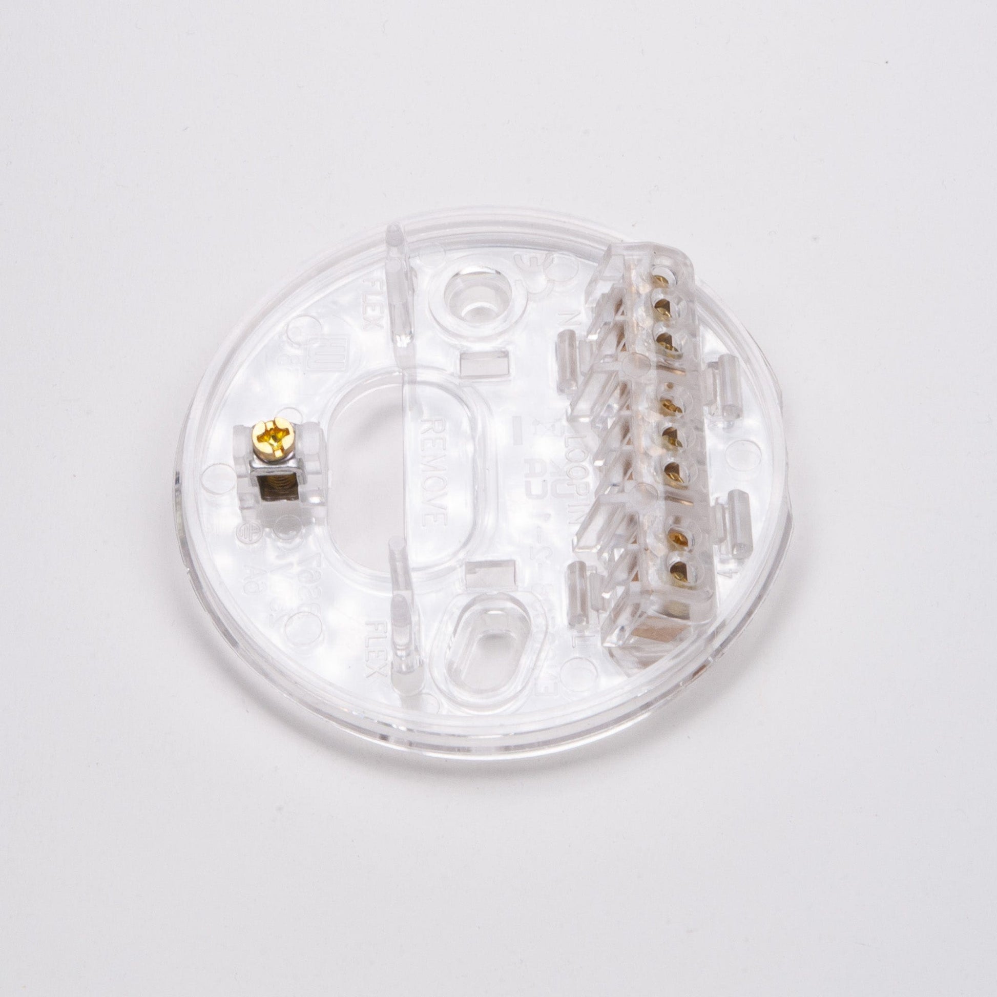 It has a diameter of 85mm and overall height of 30mm and includes a moulded mounting plate with electrical terminals.