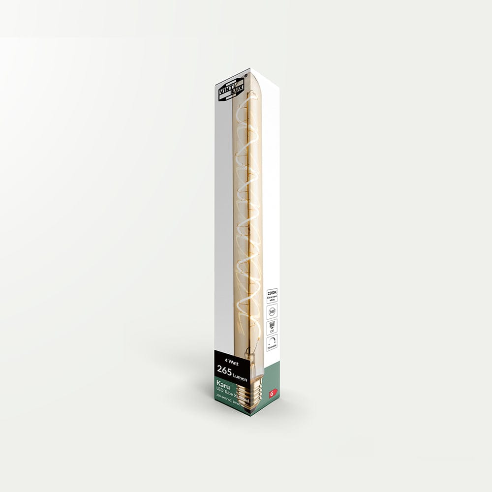 This Vintlux® Filament LED Lamp Karu Gold Tube 300mm is suitable for E27 fittings and has a wattage of 4 Watt. With a light intensity of 265 Lumen and a colour temperature of 2200K, the lamp provides extra warm white light. The gold-colored glass gives a special appearance that, in combination with the tube shape, provides a pleasant light distribution. These LED lamps have spiral wound filaments which give an eye-catching playful effect. The light sources can be used on their own or they can be placed in a beautiful table or wall lamp.